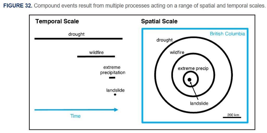The Assessment doesn’t just acknowledge this in passing: there are many pages of narrative discussion explaining how climate risks can “compound,” including a strong recommendation for further work to be done exploring compound impacts. The discussion, for example, of how drought in California led to wildfires and landslides is very reminiscent of what happened in BC this year, and could have helped us to better prepare.