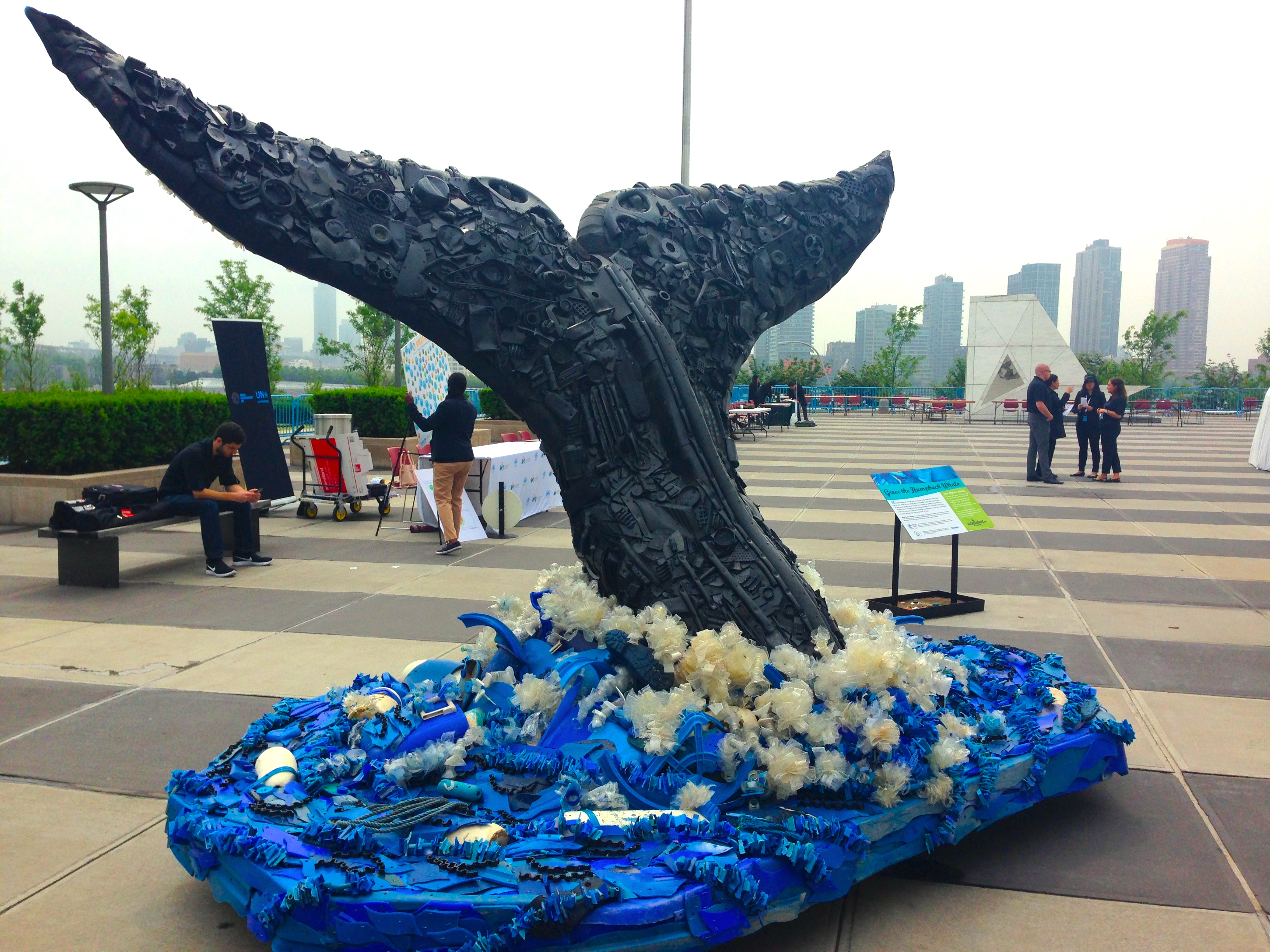 Top photo: Artwork made of plastic debris at the UN Ocean Conference, June 2017. (Photo: Linda Nowlan)