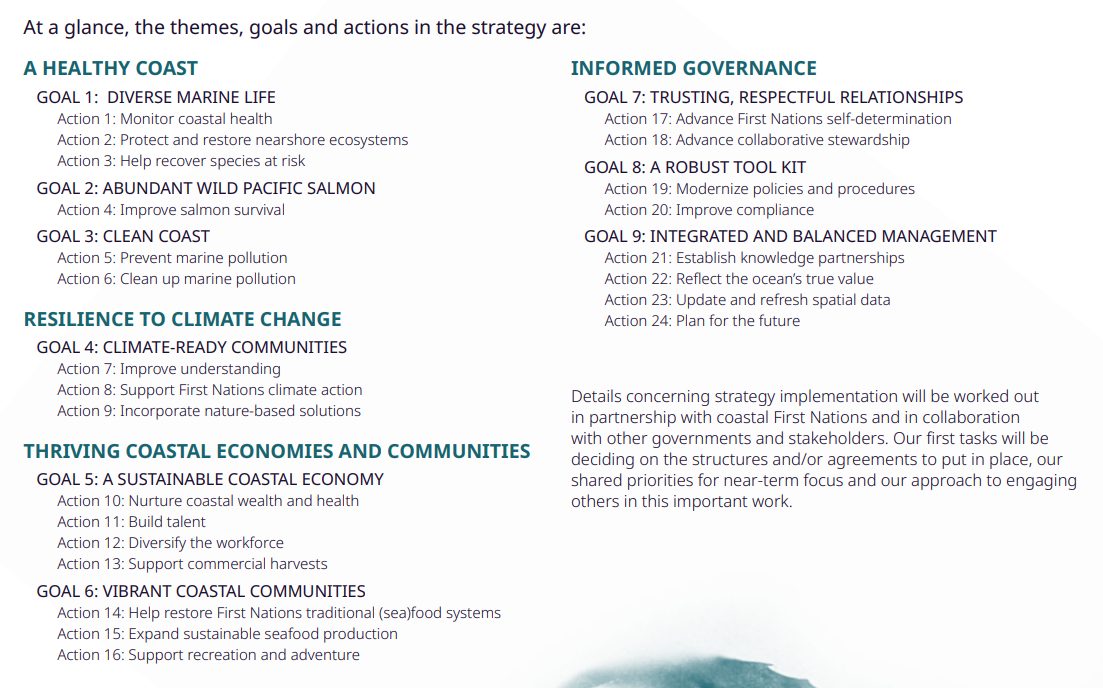 The BC Coastal Marine Strategy outlines four themes: healthy coastal marine ecosystems, resilience to climate change, thriving coastal economies and communities, and informed governance. Under these themes are nine goals and 24 supporting actions to achieve its vision for “a diverse, productive, and resilient coastal marine environment that is valued in its own right and that supports the prosperity, health and well-being of coastal communities now and into the future.”