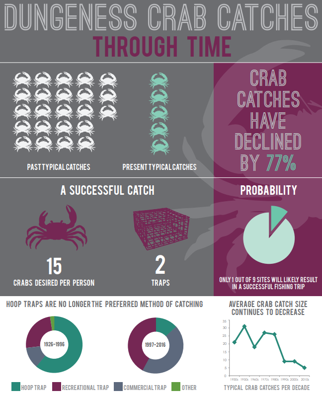 Dungeness crab catches through time. Research was a partnership among the Heiltsuk, Kitasoo/Xai’xais, Nuxalk, and Wuikinuxv Nations, the Central Coast Indigenous Resource Alliance, and the University of Victoria’s School of Environmental Studies. Used with permission.
