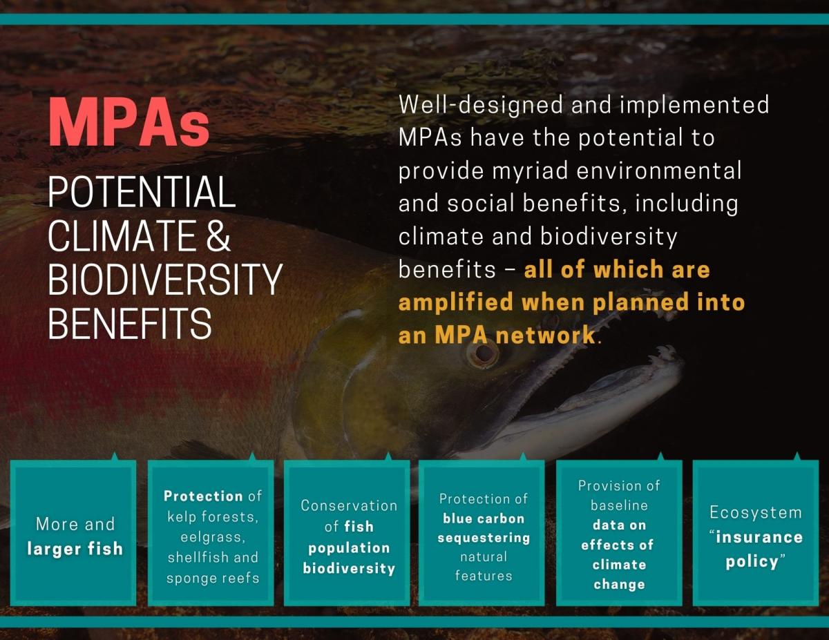 Well-designed and implemented MPAs have the potential to provide myriad environmental and social benefits, including several related to mitigating and adapting to the climate and biodiversity crises. MPAs can:
