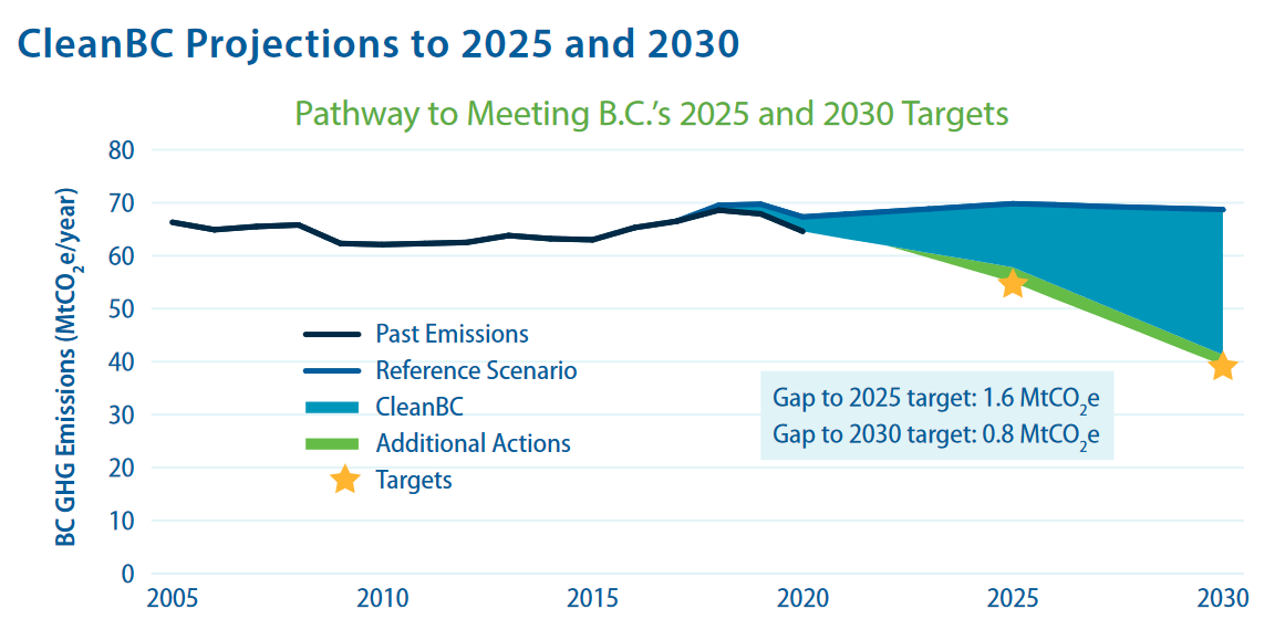Second, in reality the gap for both targets – but especially the 2030 target – is much larger than the graph indicates. Some of the emissions reductions attributed to the CleanBC plan are currently imaginary. CleanBC proposes to come up with actual plans or policies in the future to achieve these reductions, but as yet there is no actual plan or policy. Others are still in the design phase. So, some of the reductions associated with CleanBC are as much “Additional Actions” as the additional actions indicated in green.