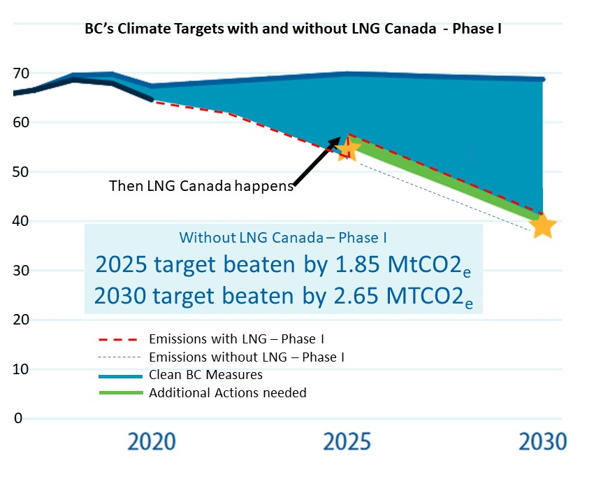 BC should be on track to beat our 2025 and 2030 targets. Instead, we’re scheduled to miss both as a direct result of LNG Canada (although there is still time to catch up to the 2030 target).