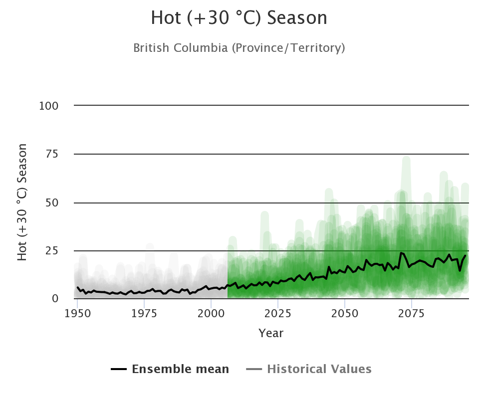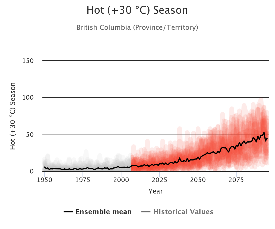 Provincially, BC has had average of 4.2 days per year when the air temperature exceeds 30°C (during the 1976-2005 period). Under a “high carbon” scenario in which we do little to curb fossil fuel emissions, the number of 30°C+ days are expected to increase to nearly 30 days per year in the period of 2051-2080. Under a low carbon trajectory (where global warming is limited to around 1.8°C), the number of very hot days is lower, at 17.2 per year.
