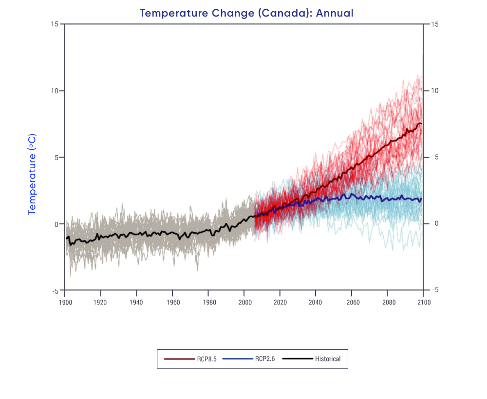 Projected annual temperature change for Canada this century under a low emission scenario (RCP2.6) and a high emission scenario (RCP8.5) from Canada’s Changing Climate Report (Changingclimate.ca)