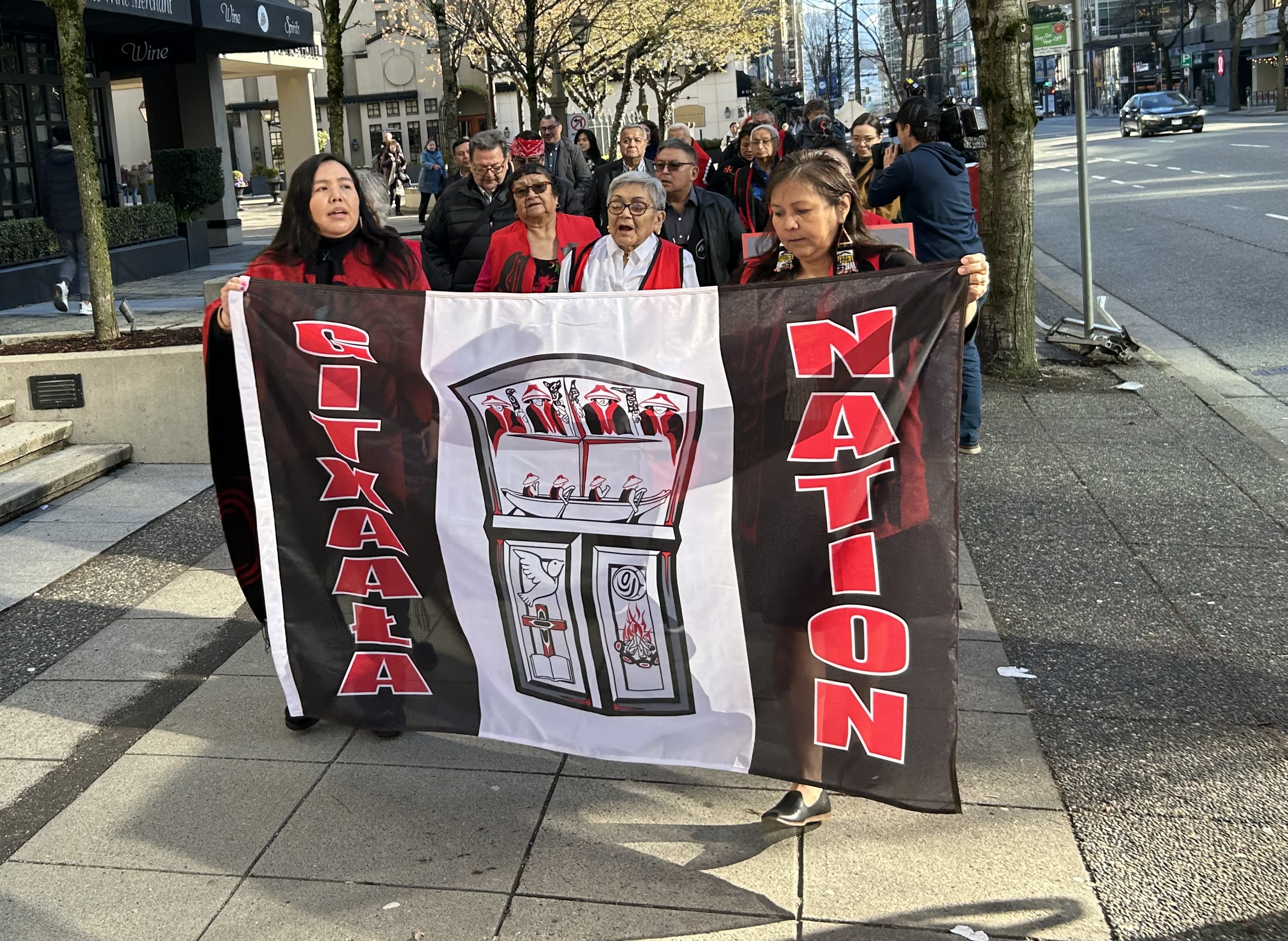 Top photo: Gitxaała leaders and supporters en route to the Courthouse for April 2023 hearing / Alexis Stoymenoff