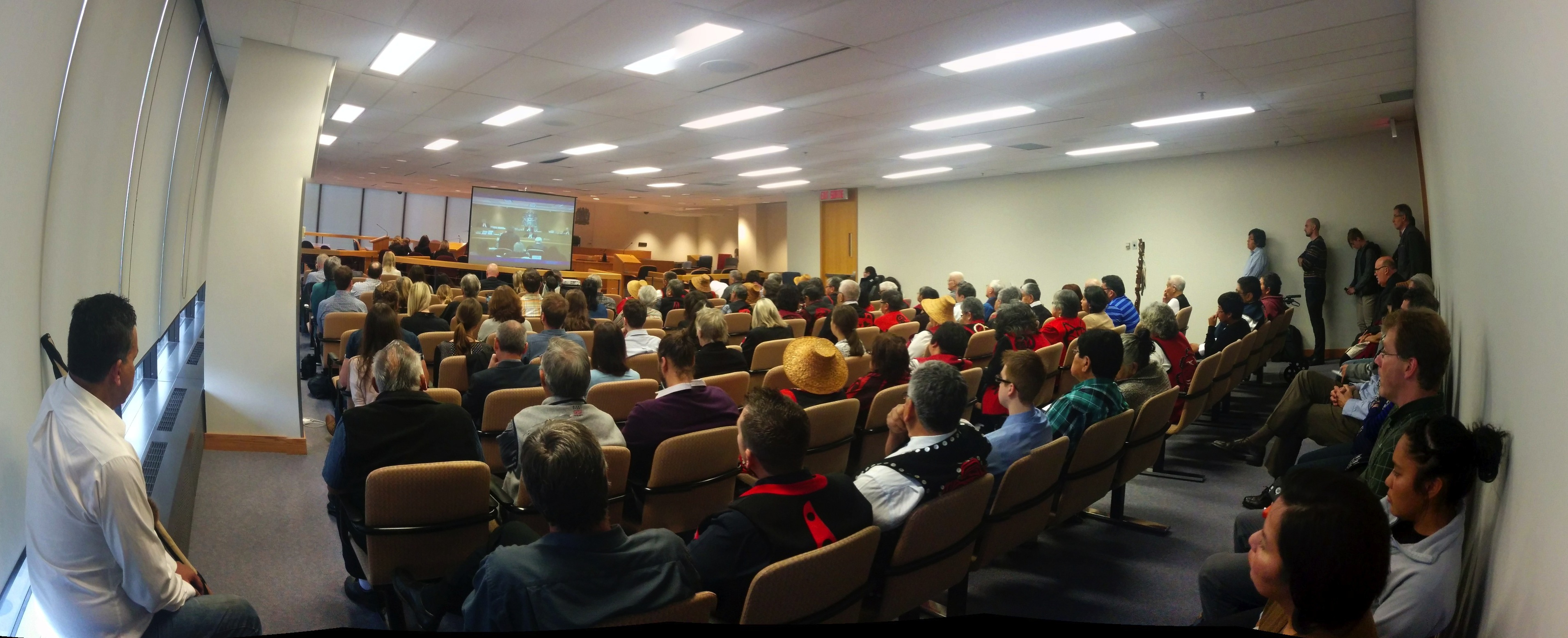 The courtroom was packed tight today and the air was charged. Chiefs, community members, lawyers and media sat side-by-side to watch the proceedings unfold, filling out every corner of the 100 person capacity room. Three lawyers were each given 85 minutes to make their case in front of the panel of three Federal Court of Appeal judges. The legal arguments centered on the Crown’s failure to consult with First Nations before approving the Enbridge pipeline project (see WCEL Legal Backgrounder for a high-level summary of the legal arguments). All three lawyers delivered eloquent submissions with concise arguments and clear responses to the Panel’s questions.