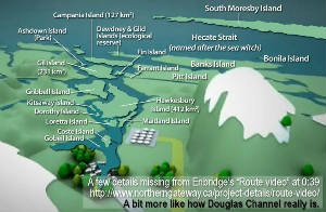 People familiar with the BC coast – particularly anyone who has kayaked it – will know that our coastline is torturously convoluted and replete with plentiful islands and islets. Enbridge’s portrayal of the channel was so obviously wrong that I felt it was very important to try to make others aware of the disinformation on Enbridge’s website. I set about to create a series of images to demonstrate that Enbridge had begun with an accurate dataset, but that they had manipulated the data to remove all of the islands from Douglas Channel, and I estimated the quantity of land mass area that Enbridge had removed, so that people could readily understand the implications of the removal of those land masses from the animations. By creating overlays from Google Earth, I was able to show that the majority of the coastline in Enbridge’s model was accurate – Enbridge simply removed all of the islands from Douglas Channel, leaving the rest of the coastline and only a couple of islands at the mouth of the channel intact.