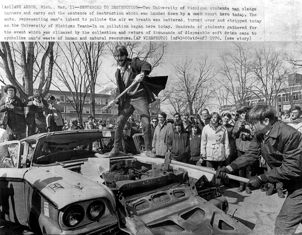 Car smashed at University of Michigan on Earth Day 1970 (AP/Wystan via Flickr Creative Commons)
