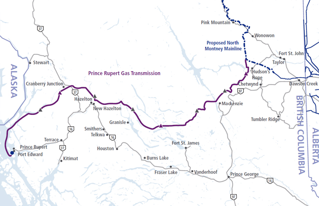 The PRGT was a proposed 900-kilometre pipeline owned by pipeline giant TransCanada. It would have started in Hudson’s Hope, BC and ended at the Pacific NorthWest LNG liquefaction plant proposed for Lelu Island, near Prince Rupert.