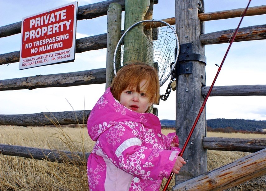 Top photo: Rick McGowan's young granddaughter at the gate blocking access to Stoney and Minnie Lakes. (Photo: Rick McGowan, Nicola Valley Fish & Game Club)