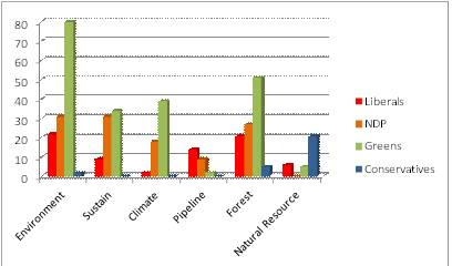 The references found in the NDP Platform to our environment-related terms are: Environment (31), Sustain (31), Climate (18), Pipeline (9), Forest (27), Natural Resource (0 – although there are a number of references to the “Resource Economy”).