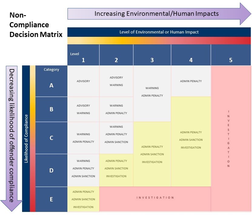 The Matrix suggests that offences that involve the most serious environmental consequences, or offenders who are actively lying to or working to frustrate law enforcement, should always be investigated for possible charges. (See the area shaded in red in our adapted matrix).