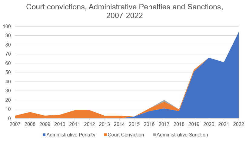 But far from being the prominent tools contemplated by the Act, charges/convictions and administrative sanctions are almost never being used, even for the most serious repeat offenders. For the last five years of data for offences, 19 administrative penalties were handed out for every 1 court conviction. There were no administrative sanctions issued.