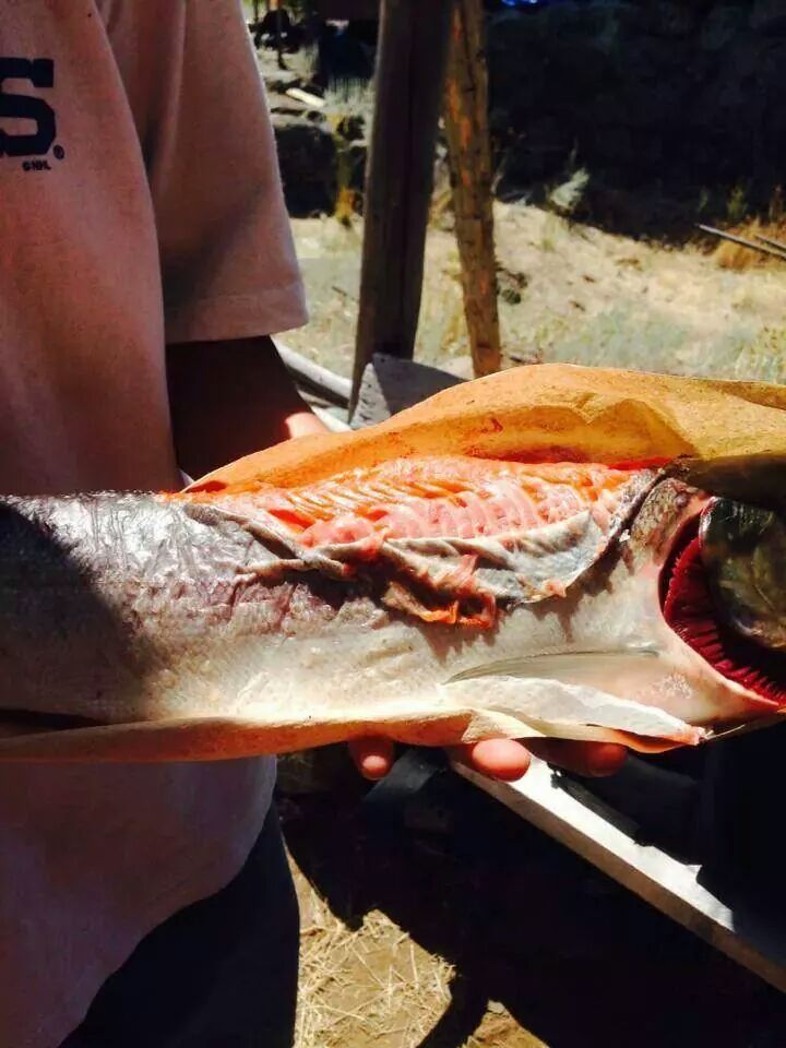 A salmon caught from the Fraser River after the Mt. Polley tailings pond spill. Xaxli'p, Sek'wel'was & Tsk'way'laxw First Nations have closed all fishing activities due to contaminated fish. Photo credit: Turner LeBourdais. |