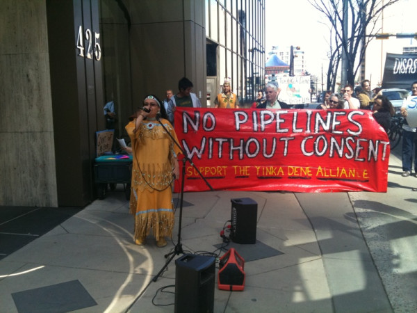 This message wasn’t just broadcast to people on the streets. Representatives of the Yinka Dene Alliance attended Enbridge’s annual meeting of shareholders and had the opportunity to speak directly to executives, the board, and financial media. Inside the annual meeting, they spoke in a personal way about the impacts that Enbridge’s pipelines – and inevitable oil spills – could have on their people, lands and waters, if the project is built. They made clear that their decision not to accept the pipelines came after several years of carefully considering the project, including conducting their own study prior to making a decision (Download: summary of report; full text). That decision, they stated, is one that is based in their own Indigenous laws as Yinka Dene people, and is expressed in the Save the Fraser Declaration, signed in December 2010.