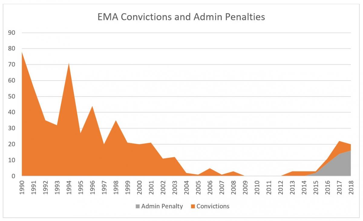 We believe that there are many more offences that deserve convictions or administrative penalties, but it appears (at least so far) that administrative penalties are not replacing the use of charges/convictions. In 2017, there were eight convictions under the EMA, which is the highest number since 2003. Although there were only four convictions in 2018 (and a record 16 administrative penalties), that is still more convictions than many of the past 15 years.