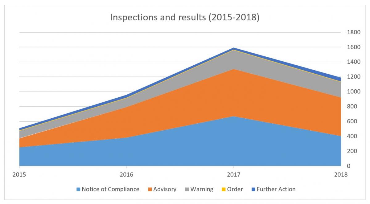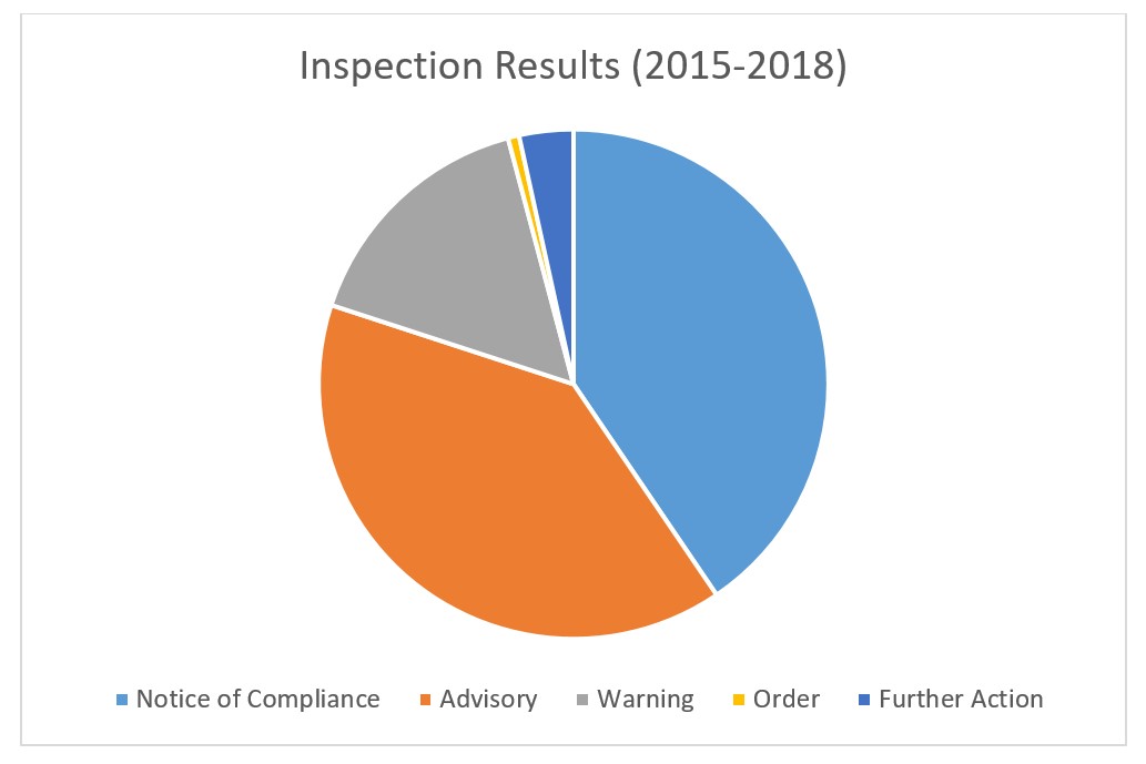Each inspection listed the result in the data records. Overall the inspectors found some level of non-compliance with the EMA in about 60% of inspections, but the vast majority of those were dealt with through written statements with no direct consequences.