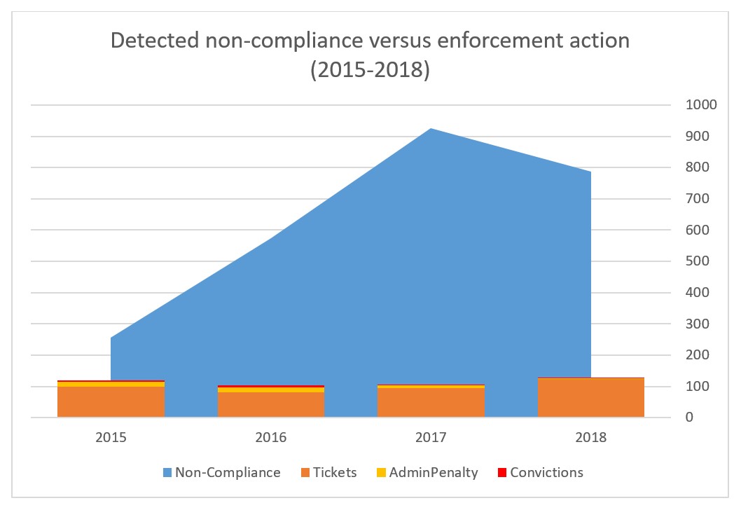 ** - To be clear – the inspections from 2015-2018 did not necessarily result in these particular penalties. While tickets can be issued fairly quickly, administrative penalties and convictions may take months or years to materialize, so offenders that were referred for further action in 2018 almost certainly have not yet had their penalties/convictions confirmed.