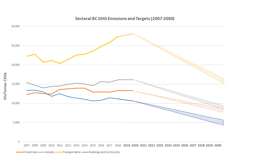 On 26 March 2021 the BC Government unveiled “sectoral targets” – a range of emissions reductions that different sectors of the BC Economy will (if all goes according to plan) meet by 2030. These are not binding on the individual sectors, but will guide government planning and progress reporting as we move towards the Province’s 2030 goal to reduce overall greenhouse gas emissions compared to 2007 levels by 40% by 2030.