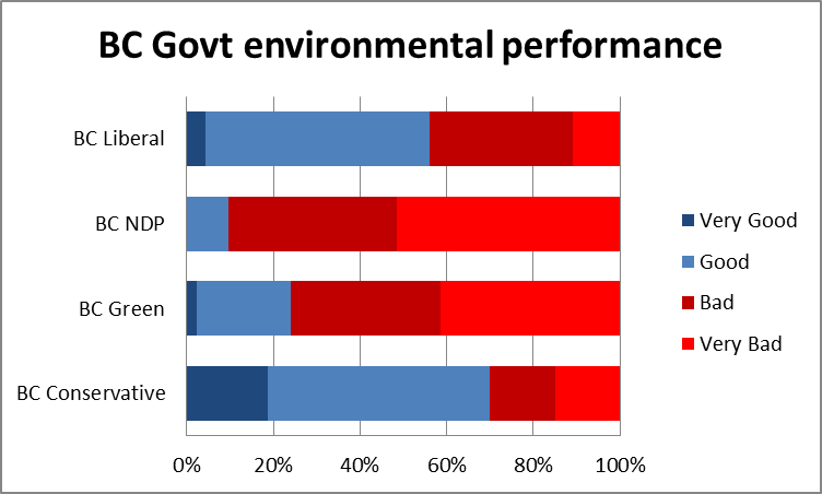 Over 40% of 2013 BC Liberal voters who have an opinion on the government’s environmental management are not impressed. BC Conservative voters were quite a bit more positive about the government’s environmental track record, but even then 30% didn’t like it. And clearly NDP and Green voters want to see more environmental leadership.