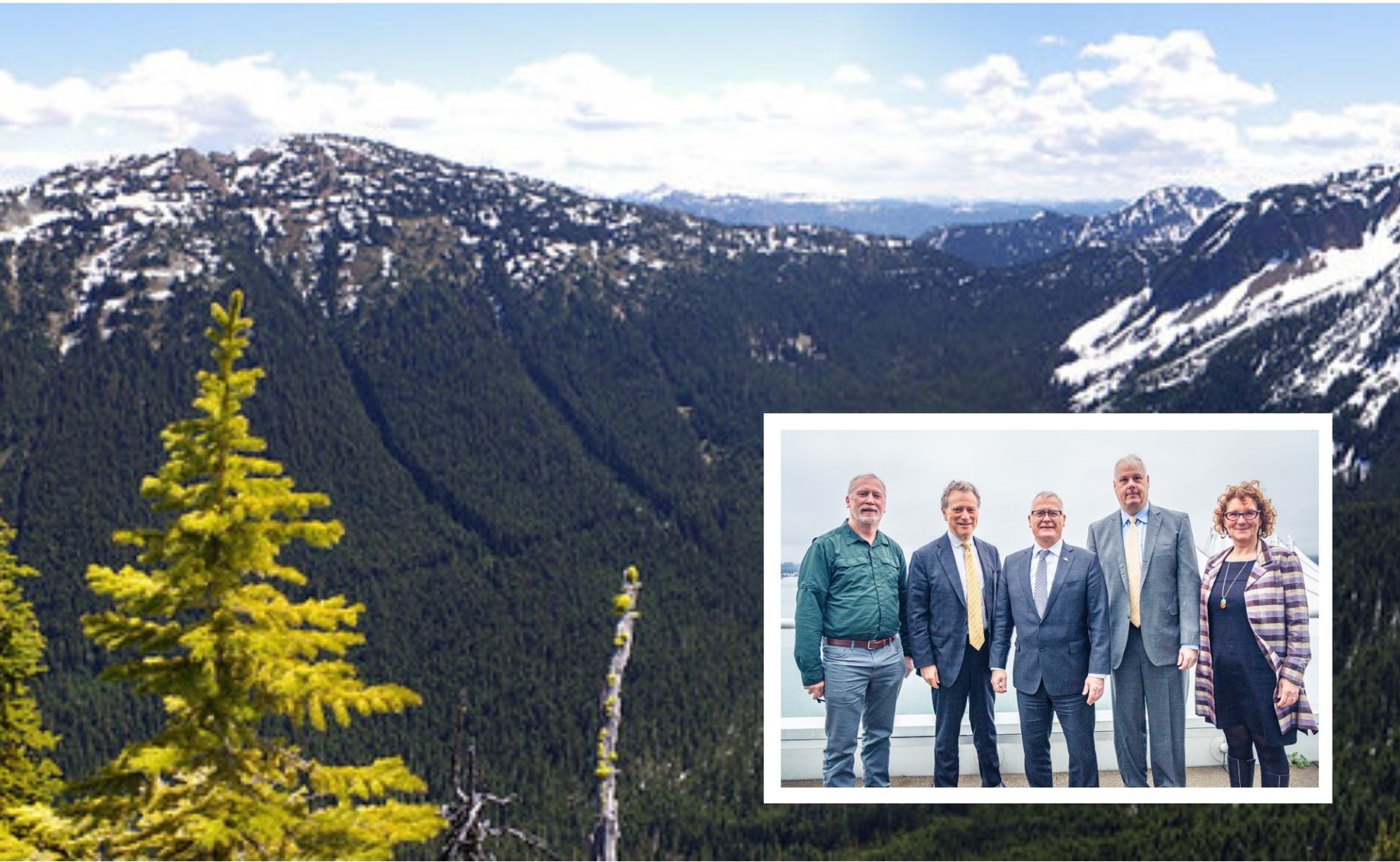 Inset: From right to left - Joe Foy of the Wilderness Committee, Minister of Environment and Climate Change Strategy George Heyman, FLNRORD Minister Doug Dondaldson, Skagit Environmental Endowment Commission (SEEC) Canada Co-Chair Thomas Curly and SEEC Canadian Commissioner Shannon Bentley after the announcement to ban logging in the Donut Hole an unprotected area located between Manning and Skagit provincial parks. (Photo: Alex Hsuan Tsui/Wilderness Committee)
