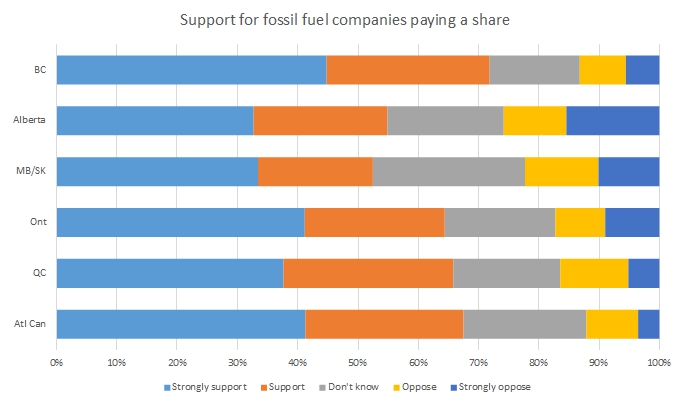 This result is encouraging, but less impressive than the answer to a similar question in a poll of British Columbians that we commissioned Justason Market Intelligence (JMI) to conduct in 2017 which found that 82% of British Columbians strongly or somewhat support holding fossil fuel companies accountable for a share of climate costs.
