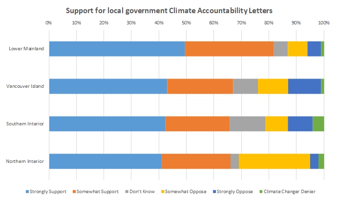 In the 2017 JMI poll, we also asked British Columbians whether they support their local government sending a letter to fossil fuel companies asking them to pay their fair share of local climate costs. (We didn’t ask this question in the 2018 Google Survey). Again, there was broad support.