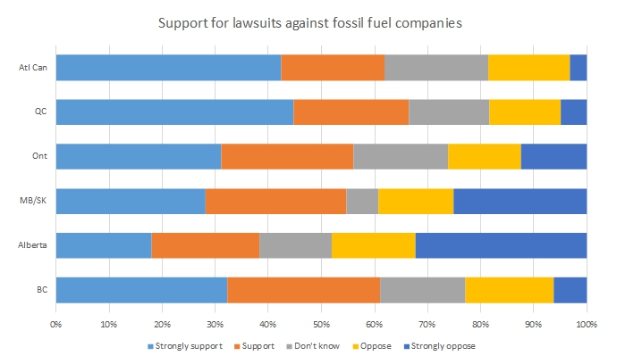 It’s ironic that the Alberta fossil fuel industry has taken such offence at a simple letter from Whistler, because the reality is that Canadians support the idea of their governments actually suing fossil fuel companies. Presumably the support is higher for suing some or all of the top 20, rather than CNRL or other Canadian companies. Even in Alberta, the province with the lowest support for climate litigation in Canada, 38% agree with the idea of using litigation to recover a share of climate costs. In BC, Quebec and Atlantic Canada support for litigation is over 60%.
