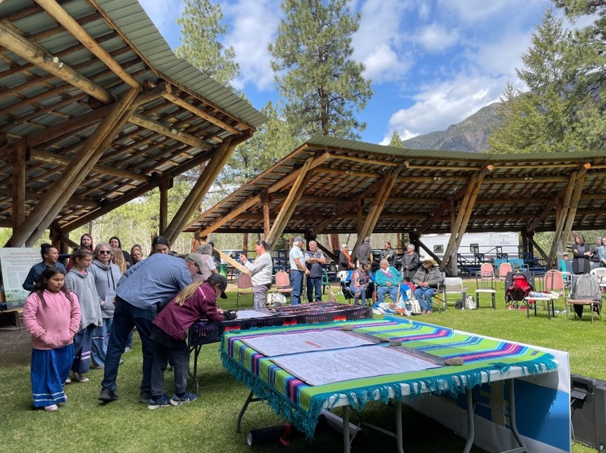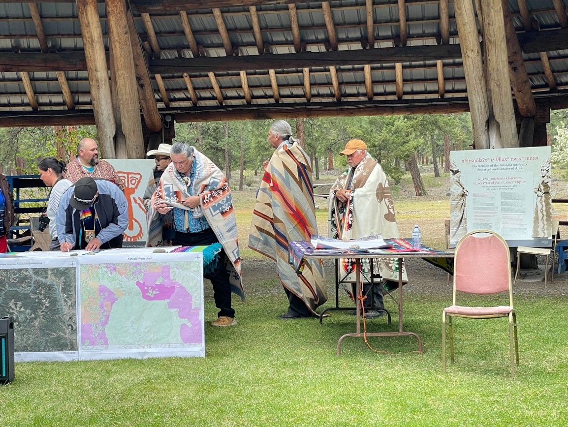 The sməlqmíx hosted a celebration and ceremony to sign and witness the nʔaysnúlaʔxw iʔ k̓łluxwnwixwmntət (Ashnola Declaration) that established the Ashnola IPCA. The event was attended by the sməlqmíx community, neighbouring relatives from the Colville Tribes and other syilx communities, allies, dignitaries, government officials, and the wider community of the Similkameen Valley. The day was grounded in ceremony, through prayer, songs, and drumming. The day’s festivities took place under the sun, in the open-air Ashnola Powwow Grounds, nestled beside the Ashnola River and surrounded by the Okanagan Mountains.
