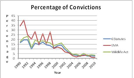 Meanwhile, hunters, fishers and guide outfitters under the Wildlife Act were also receiving far fewer convictions in 2010 relative to tickets than they did in the 1990s, but not as dramatic a decline as offenders under the Environmental Management Act. In the early 1990s about 18% of Wildlife Act enforcement actions involved a conviction. In 2010 that figure had dropped to about 4%.