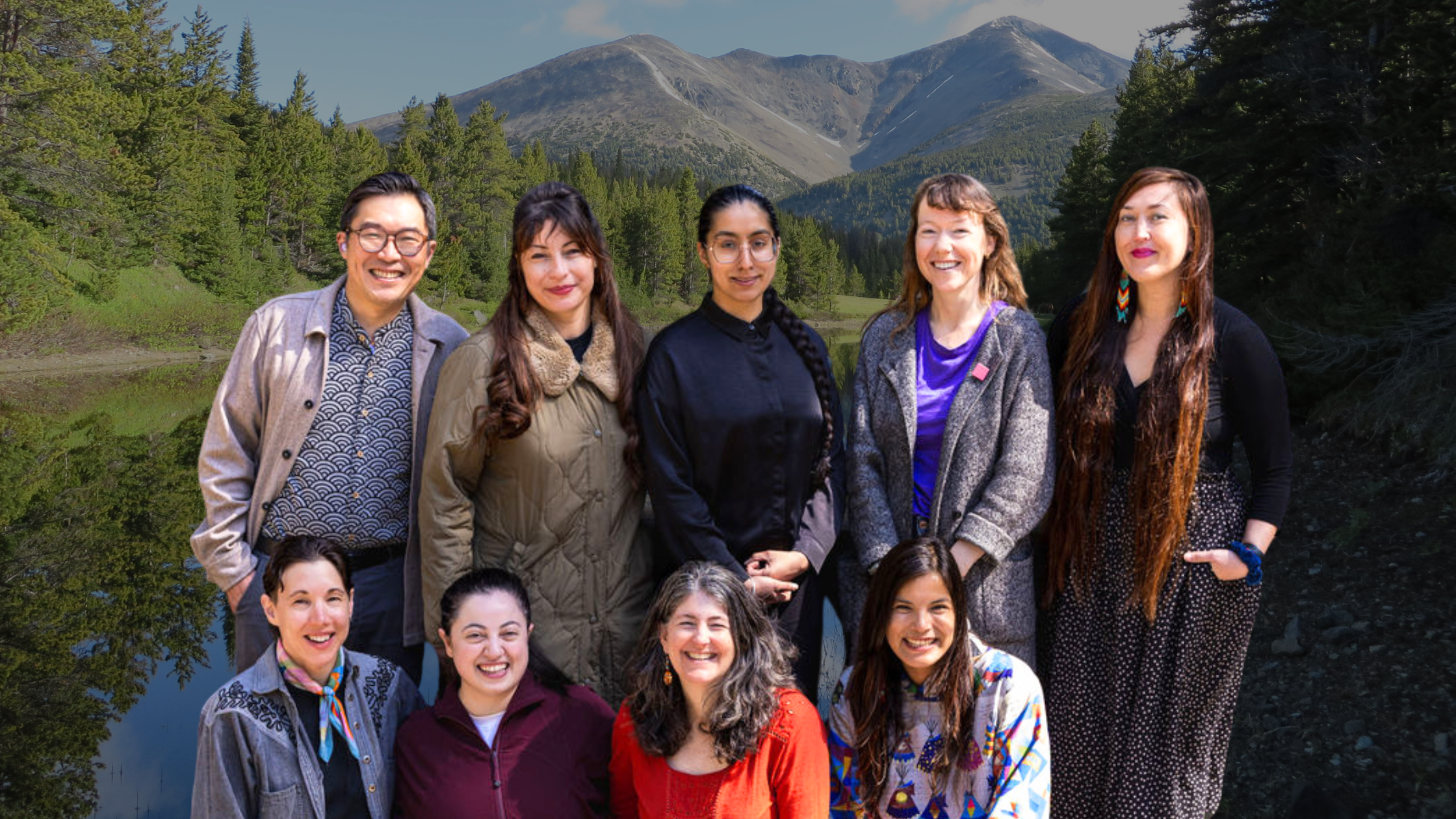 Top photo: RELAW team members / Hayf Photography. Top row (L-R): Eugene Kung, Katłıà Lafferty, Navjot Jassar, Georgia Lloyd-Smith and Estella White – ḥin̓ačačišt; bottom row (L-R): Shawn Smith, Joanna El-Mikati, Jessica Clogg and Rayanna Seymour-Hourie. Background image of Graveyard Valley Lake by Lindsay Burrows.