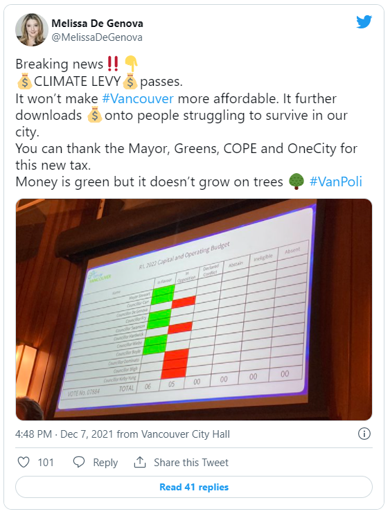 At the same time, NPA councillor Melissa de Genova tweeted a warning that the funding mechanism that the mayor was celebrating, "downloads onto people struggling to survive in our city."