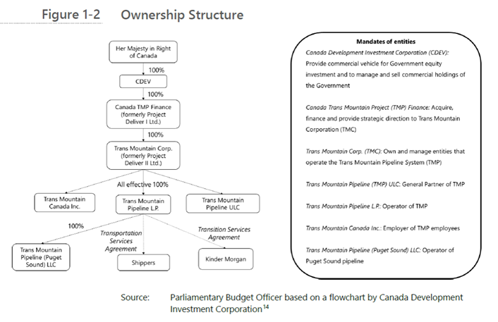 Canada’s structure of the Trans Mountain Crown Corporations makes it impossible to follow the money and allowed the NEB to ignore some of the costs associated with the purchase of the project. (Source: Parliamentary Budget Office Report)