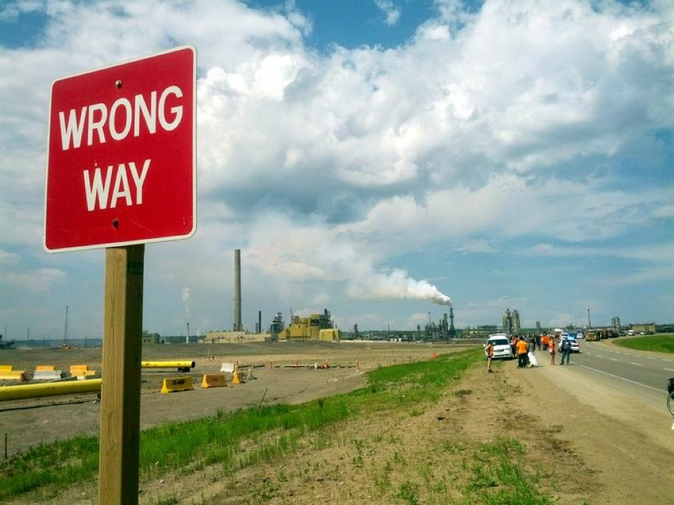 Road sign along the route of the Tar Sands Healing Walk, Treaty 6 Territory, Alberta, 2014. (Photo: Eugene Kung)