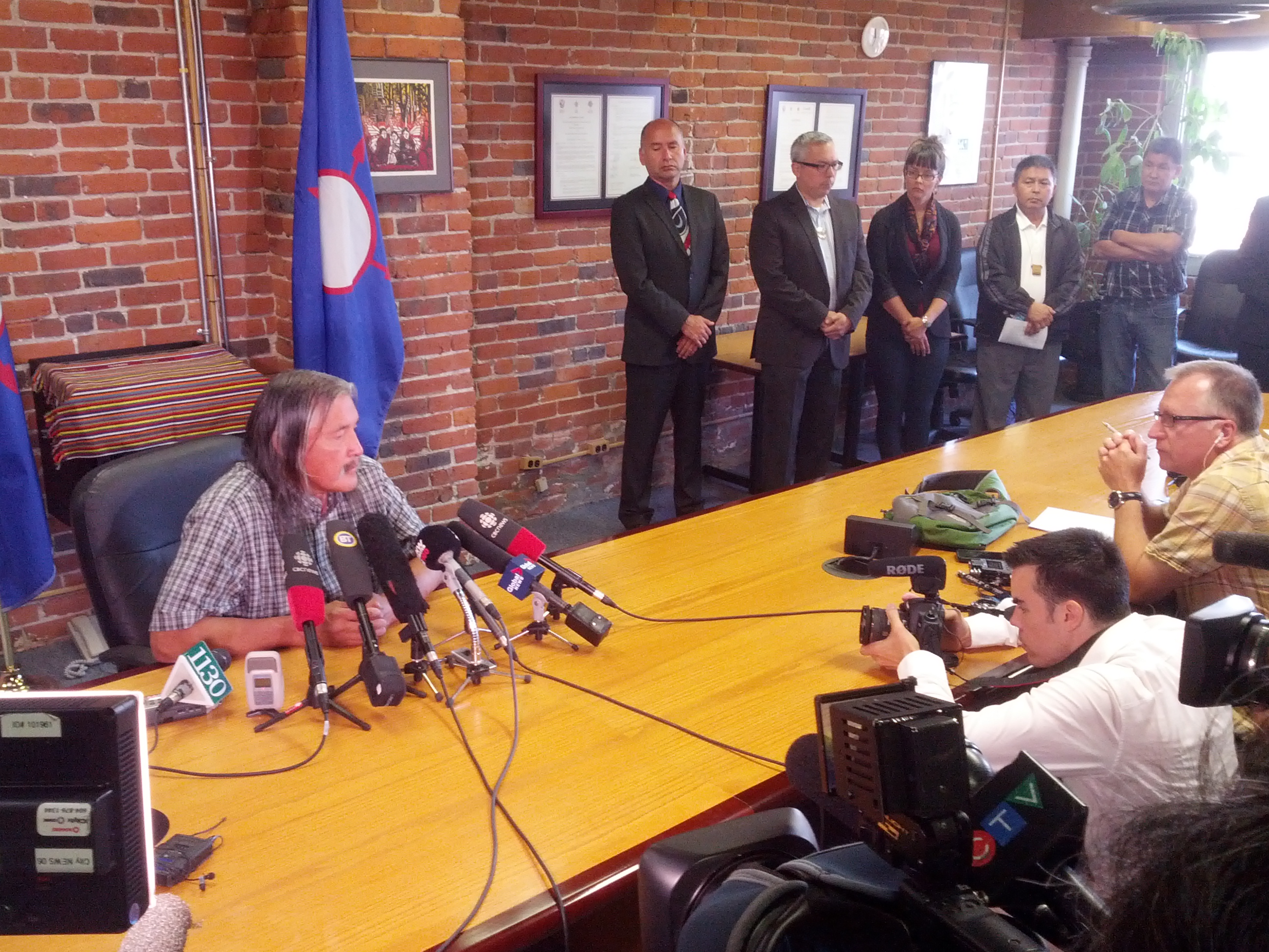 | Chief Martin Louie of the Nadleh Whut'en First Nation addresses reporters |