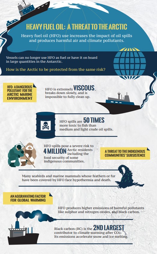 Though ships transiting the Antarctic area have been banned from using heavy fuel oils by international law since 2011, the Polar Code regulating shipping did not incorporate a similar ban for HFO use in the Arctic. HFO Free Arctic is a collaboration of groups calling for a legally binding ban by 2020.