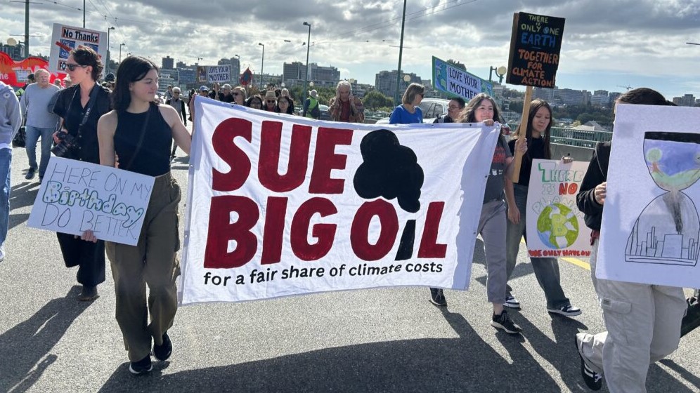 Sue Big Oil supporters carrying the banner at the 2024 Climate Strike in Vancouver.