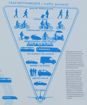 Denmark, and in particular Copenhagen, is the world’s poster-child for bicycle-friendly transportation. But that’s partly because they have aggressive goals for what transportation should look like. Have a look at Copenhagen’s Transportation Pyramid, which prioritizes biking and walking over all other modes of transportation. My parents took this photo of a Copenhagen city sign on a recent trip, and I had not previously seen anything that summarized Copenhagen’s approach to transportation planning so well in a single graphic. In essence the Copenhagen Transportation Pyramid turns North American upside-down transportation planning right-side up, and it’s worth imagining what we would need to do if we adopted similar goals.