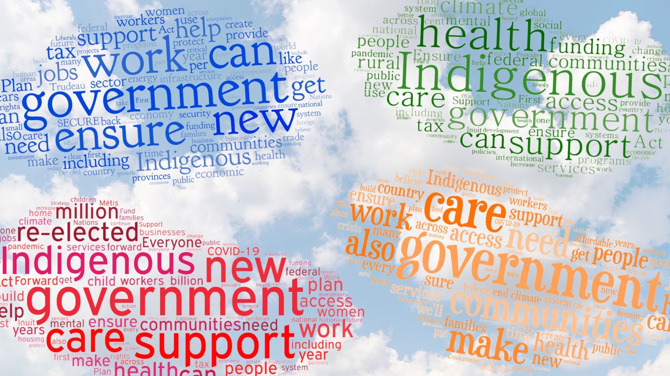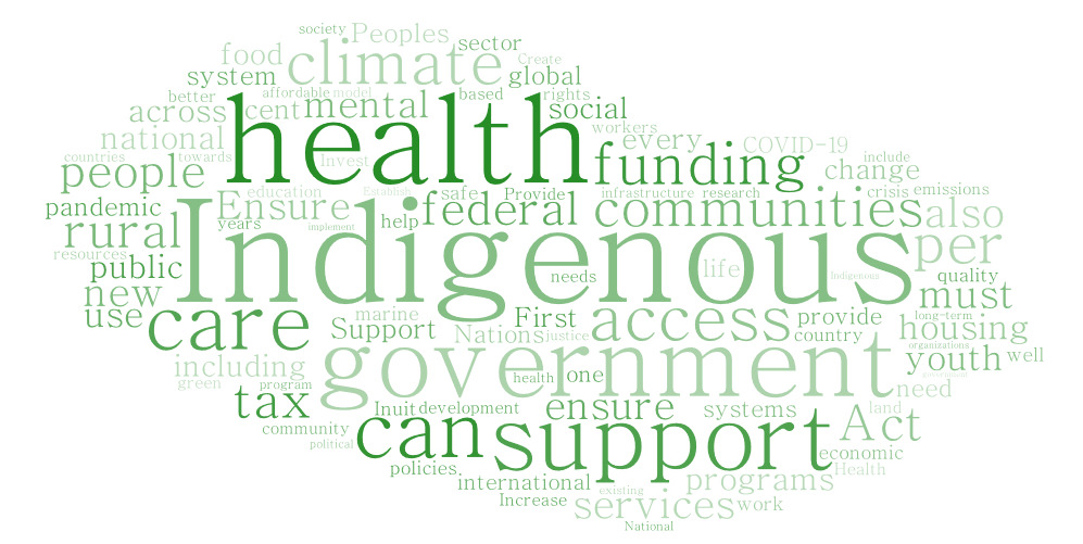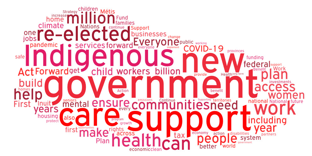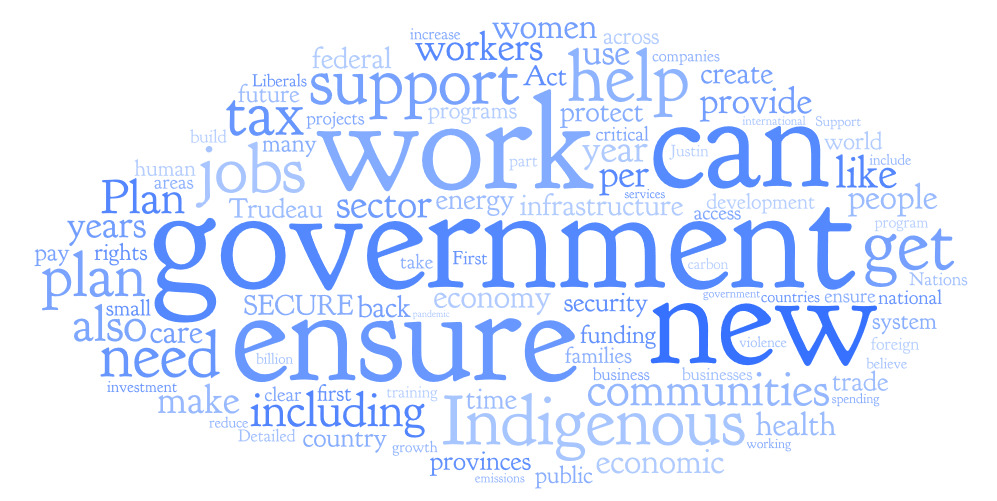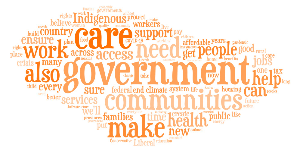 The word clouds below contain the 100 most common words that appear in each of the party platforms – excluding overly common words that appear in all platforms (like “Canada/Canadian”, the party's name, and the word “will” in relation to their commitments). The bigger the word, the more frequently it appears in the platform text.