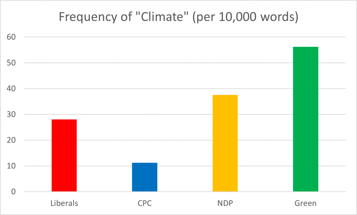 All four parties talk about climate change. Below is the relative frequency of the word “climate” among the four parties.
