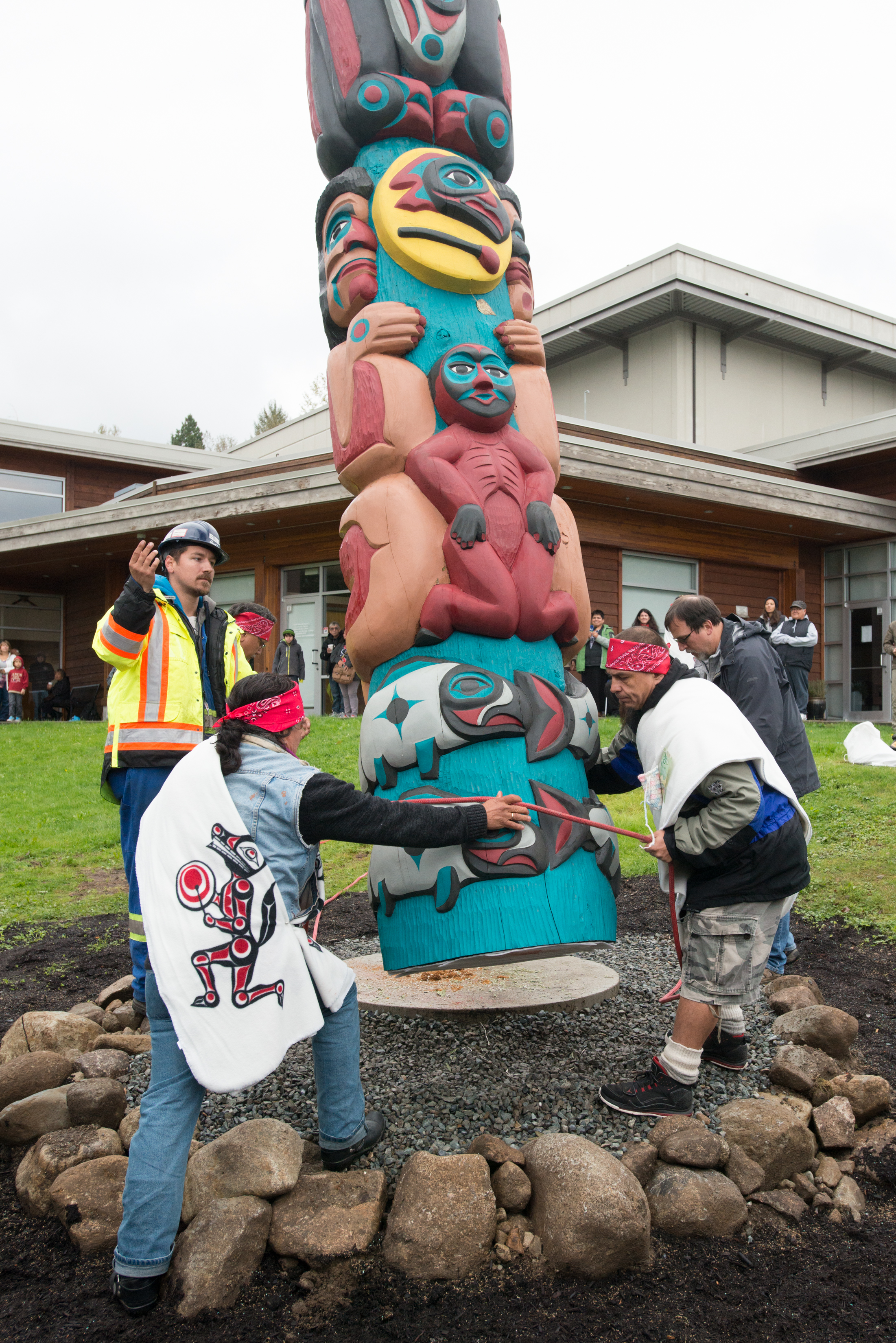 One of these moments occurred on September 29, 2013, when a unique totem pole was unveiled in Tsleil-Waututh territory. A gift from master carver Jewell James from the Lummi Tribe, the totem pole is intended as a permanent symbol of solidarity among Coast Salish Nations opposing destructive fossil fuel projects like Kinder Morgan's proposed pipeline and tanker expansion project. From its place in Tsleil-Waututh territory, the totem pole looks out across the Burrard Inlet to the Westridge Terminal, a symbol of awareness of the threats associated with the drastic expansion of tar sands oil tanker traffic proposed by Kinder Morgan for these waters. The totem pole has been given the name Kwel hoy’, meaning “we draw the line,” in the traditional language of the Lummi people. It stands as a powerful symbol of Tsleil-Waututh’s resolve to enforce their laws banning the expansion of tar sands infrastructure in their territory.
