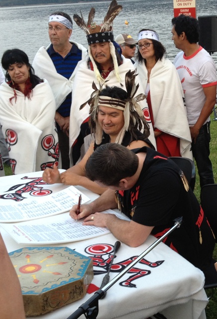 Against the backdrop of the Kinder Morgan tanker oil port, the Tsleil-Waututh and Squamish invoked the spirit of the Save the Fraser Declaration by conducting a ceremony at Whey-ah-Wichen (Cates Park) prior to formally signing. The ceremony was conducted in accordance with Coast Salish Law to welcome the Yinka Dene Alliance onto Tsleil-Waututh territory and to acknowledge them for their ongoing efforts in protecting the Fraser River and its watershed.