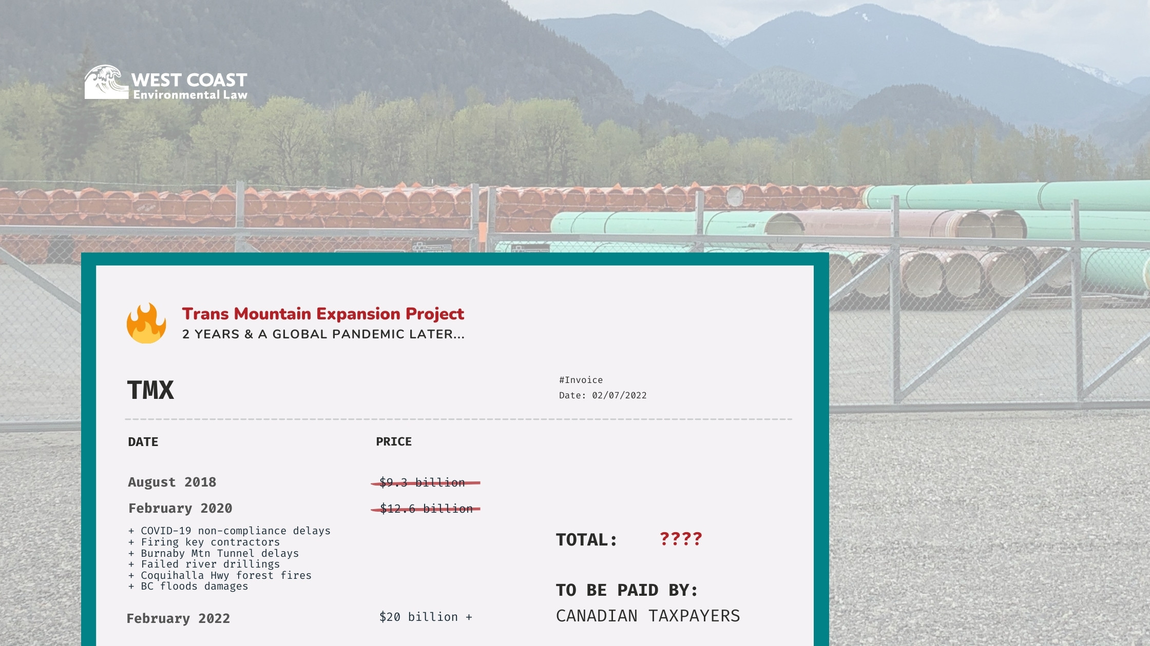 By February 2020, it was clear that the construction costs were likely even higher, and we had been asking for a cost update for six months. Then on February 7, 2020 the Trans Mountain released a new estimate: $12.6 billion – nearly three times the original estimate.