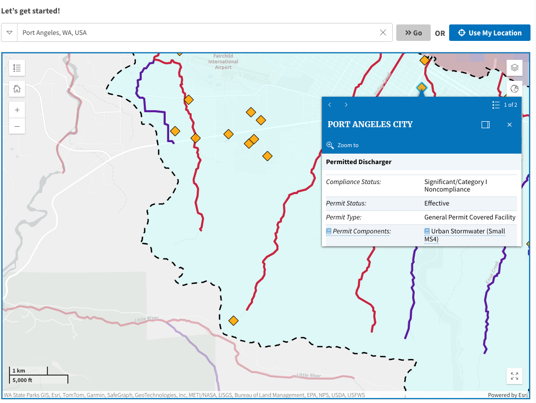 For fun, I searched up Port Angeles, which is across the water from my home in Victoria. As of August 13 2024 – the How’s My Waterway? public database says that Port Angeles City is noncompliant with its MS4 (“municipal separate storm sewer system”) permit.