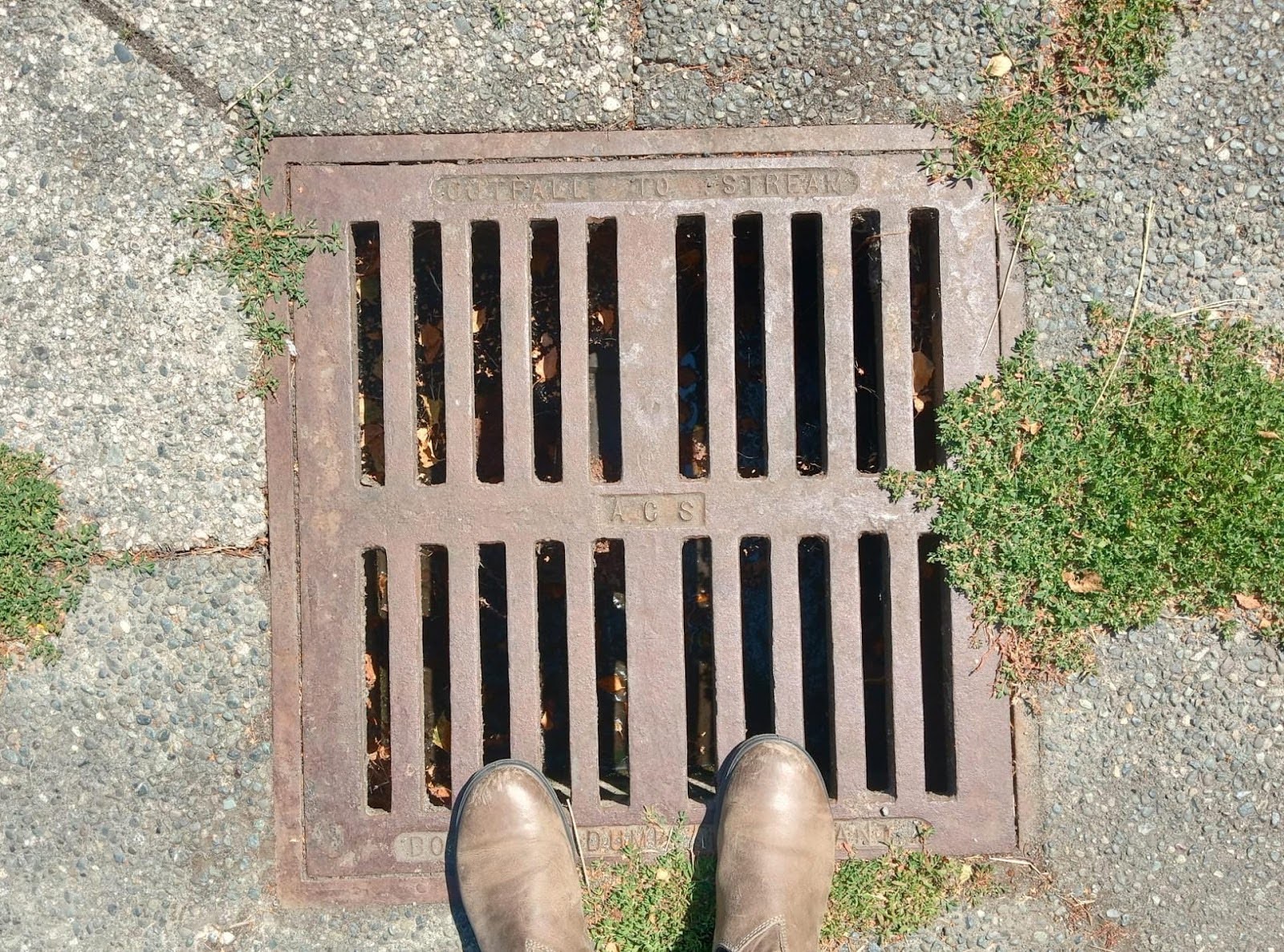 Standing on top of a stormwater drain in my neighbourhood. It says, in lettering that is difficult to make out, “outfall to stream.” Underneath my Blundstones, it says “do not dump pollutants.” Some communities have taken to marking storm drains with colourful fish symbols to remind community members where stormwater goes.