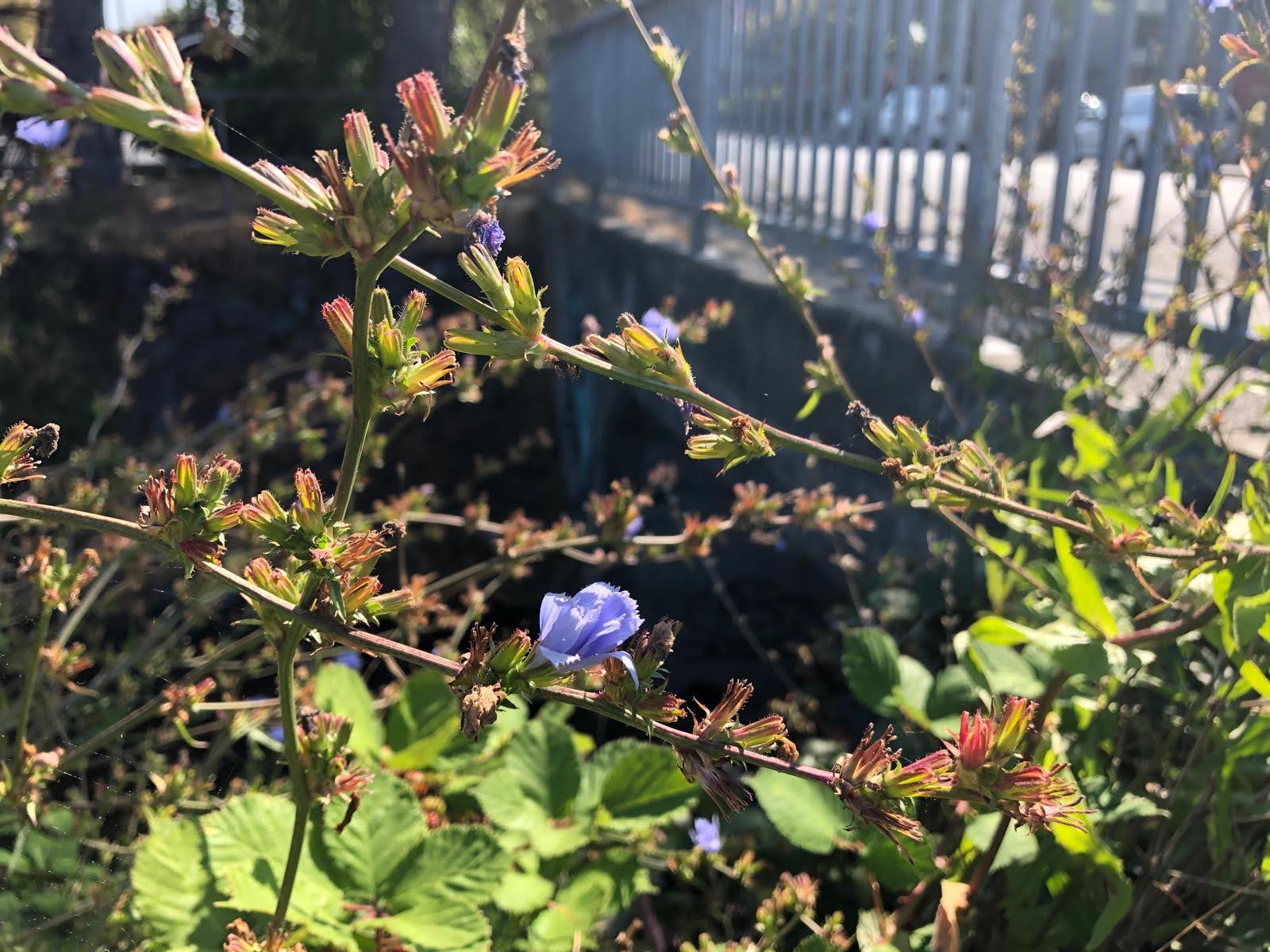 Chicory and Himalayan blackberry (both invasive species in Lekwungen territory) grow along the banks of Thaywun where it passes directly beneath a road.
