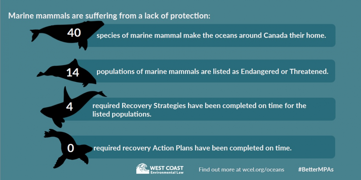 For the 14 marine mammal populations listed as endangered or threatened under SARA, 11 have been listed for over a decade and only three have had any specific management measures implemented to reduce the threats posed by commercial fishing and marine vessels.