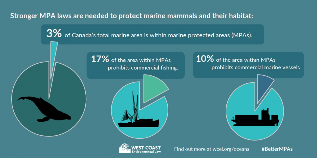 - Three of the 11 MPAs designated by Fisheries and Oceans Canada have specific objectives relating to protecting marine mammals for their establishment, but even these three had few restrictions on commercial fishing and had no restrictions on marine vessel traffic.