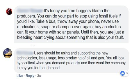 Some observers felt that individual consumers are entirely responsible, while others appeared to argue that car manufacturers or other industrial sectors should be accountable rather than the fossil fuel industry.